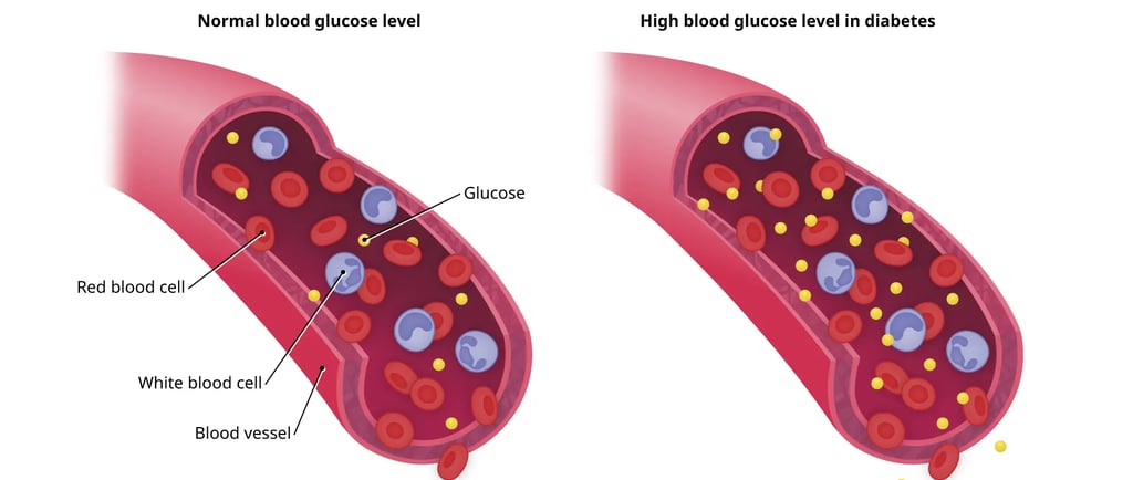 Diabetes occurs when the level of glucose (sugar) in the blood becomes higher than normal. After we eat, food is broken down into glucose, which enters the bloodstream. Insulin, a hormone produced by the pancreas, helps this glucose move into the cells where it is used for energy. In diabetes, either the body does not produce enough insulin or the cells do not respond to insulin properly. As a result, sugar remains in the blood instead of being used, leading to high blood sugar levels.